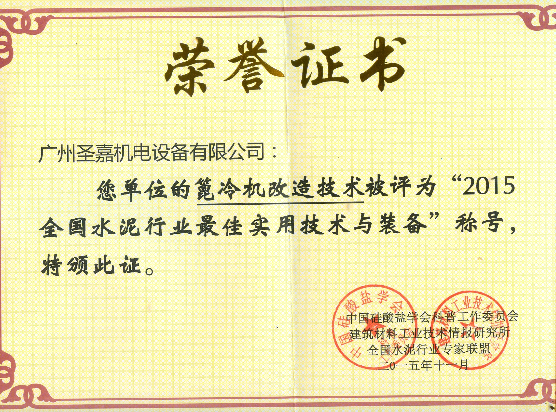 廣州圣嘉機(jī)電設(shè)備有限公司的篦冷機(jī)改造技術(shù)在由中國(guó)硅酸鹽學(xué)會(huì)科普工作委員會(huì)、建筑材料工業(yè)技術(shù)情報(bào)研究所、全國(guó)水泥行業(yè)專家聯(lián)盟舉辦的2015年“中國(guó)水泥技術(shù)年會(huì)暨全國(guó)水泥技術(shù)交流大會(huì)”上榮獲全國(guó)水泥工業(yè)最佳實(shí)用技術(shù)(BAT),獲得獎(jiǎng)牌并在中國(guó)建材報(bào)上公示,同時(shí)入選收錄在由謝克平教授編寫的“高性價(jià)比水泥裝備動(dòng)態(tài)集錦”一書中。